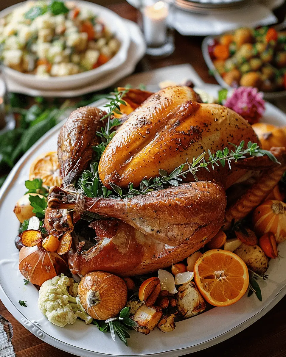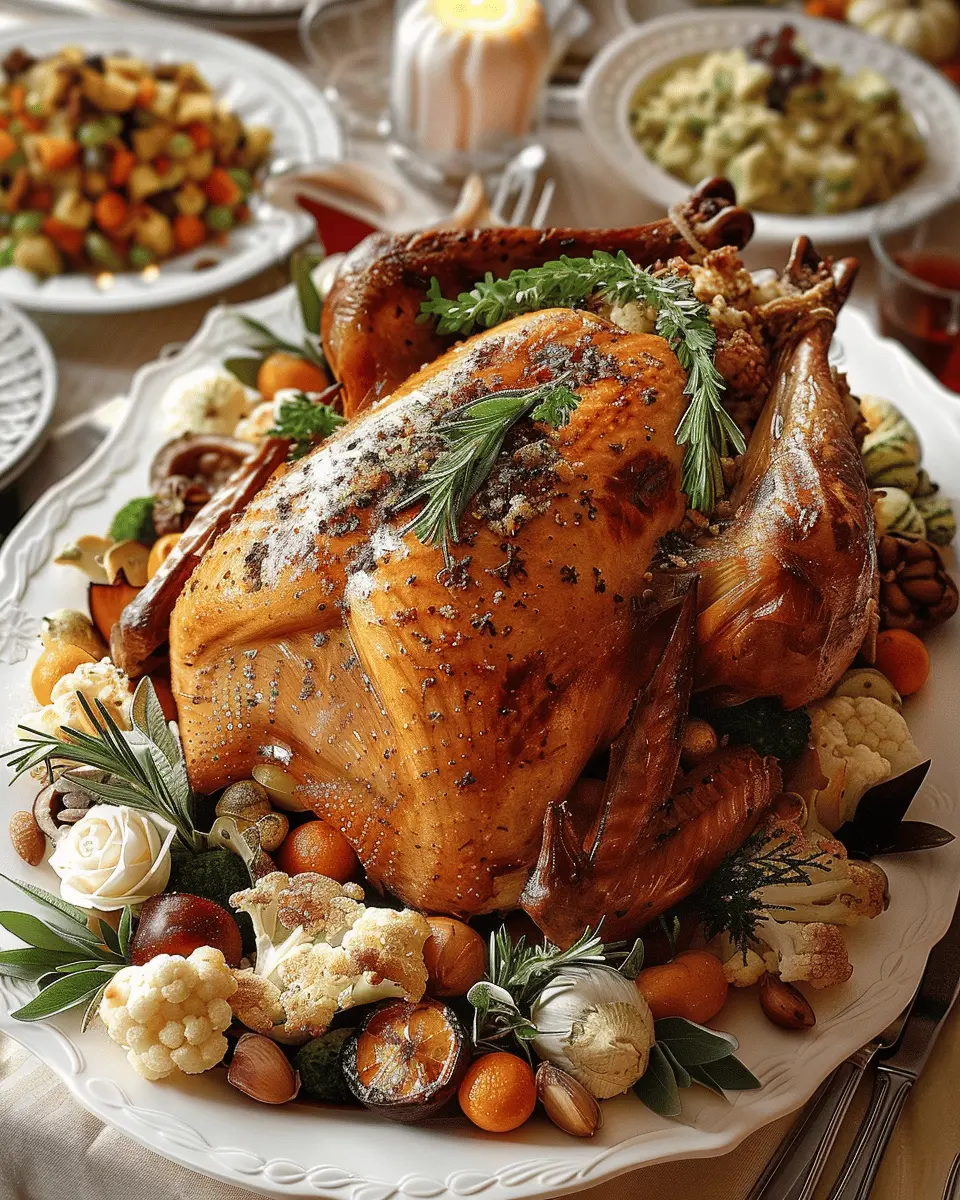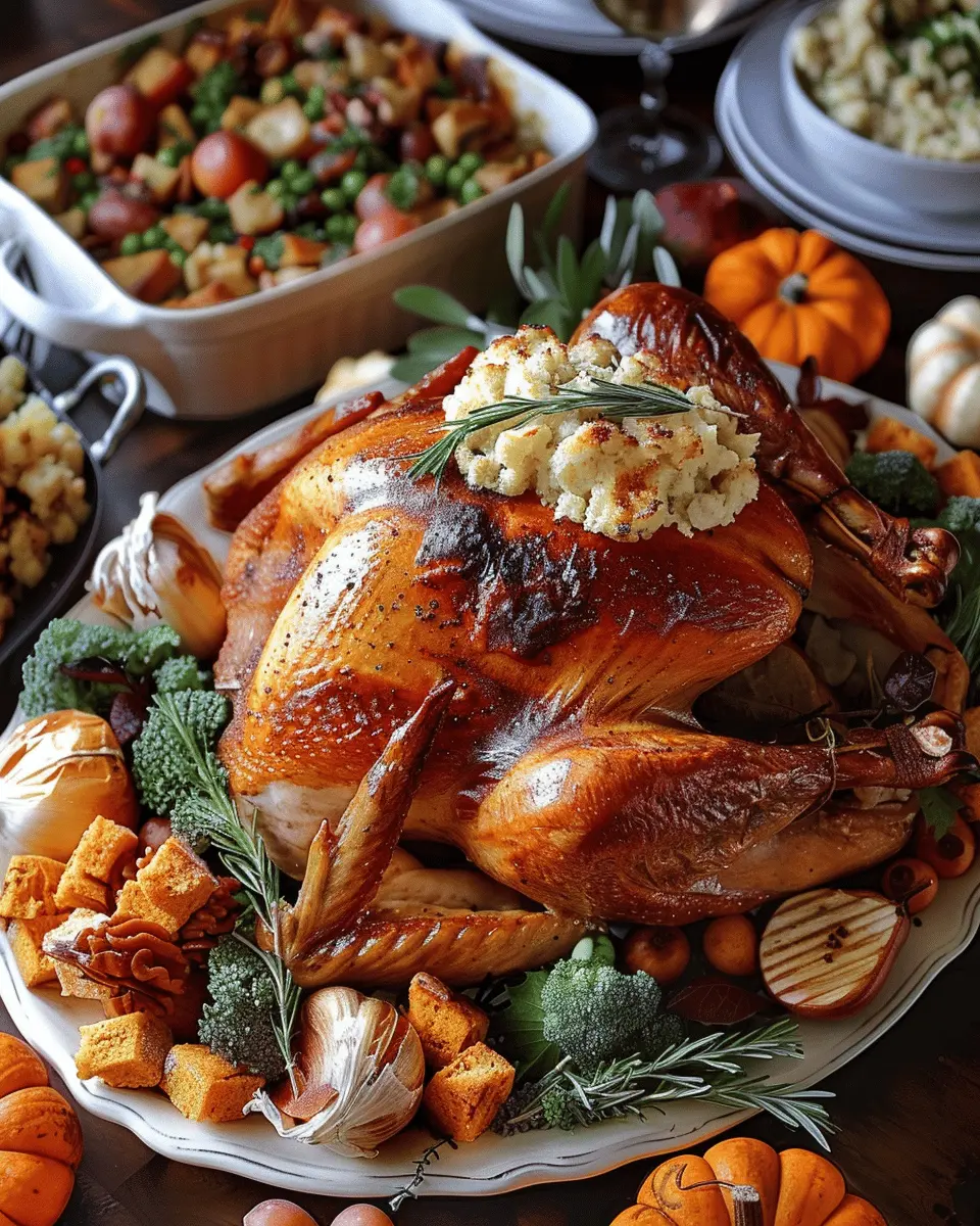 - Roasted Turkey with Turkey Bacon: A juicy, herb-stuffed turkey serves as the centerpiece.