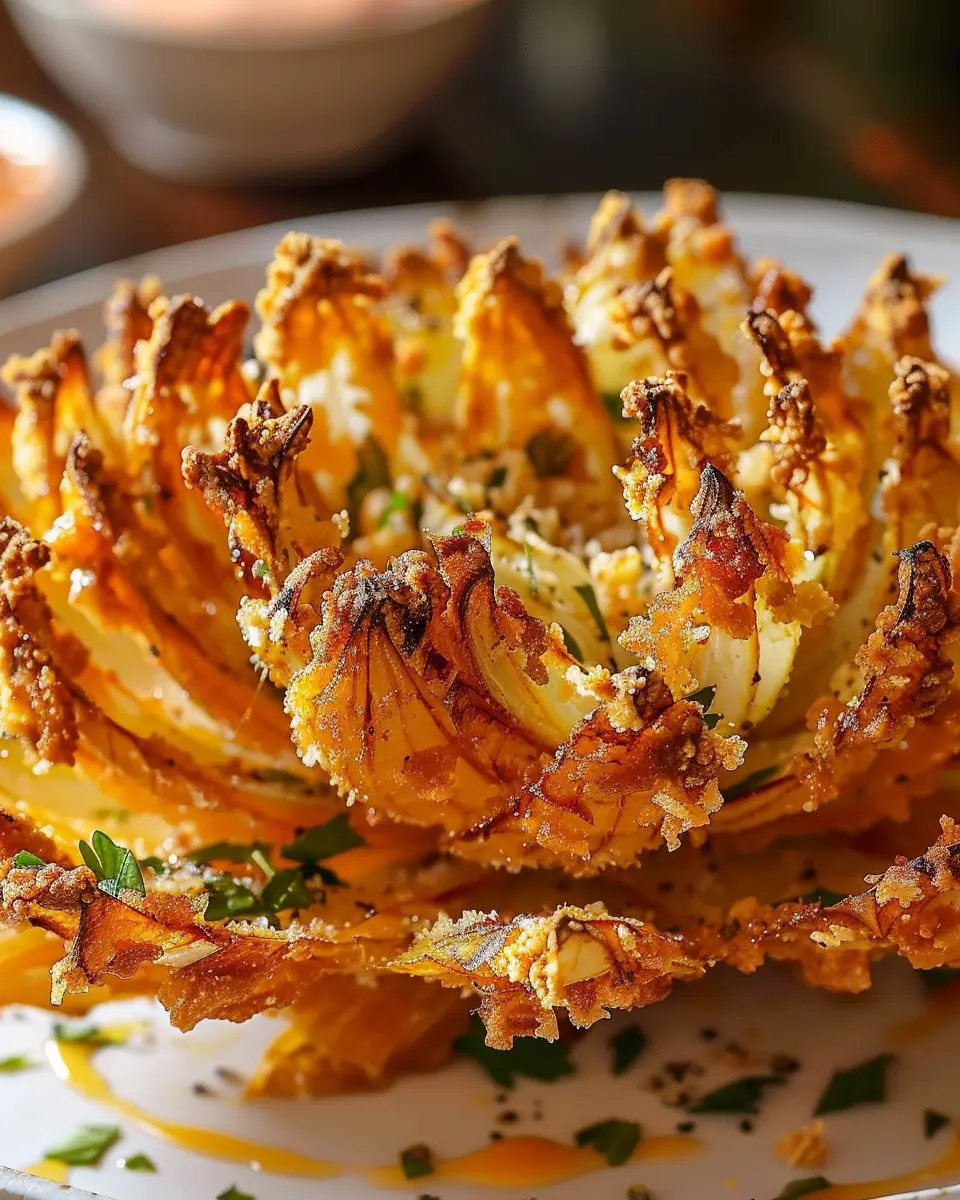 Indulge in this delicious crispy oven-baked blooming onion served with a spicy turkey bacon sauce. Perfect as an appetizer or a party snack!