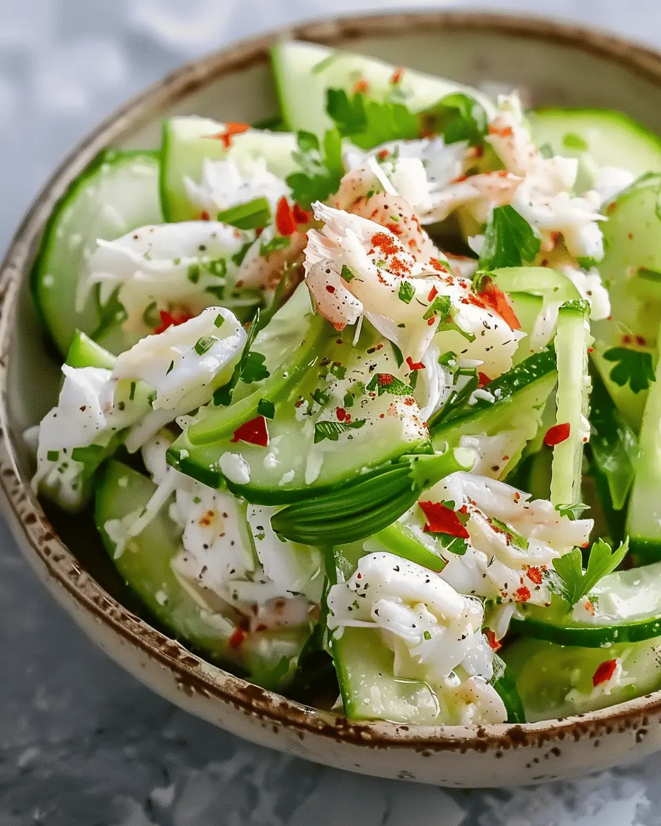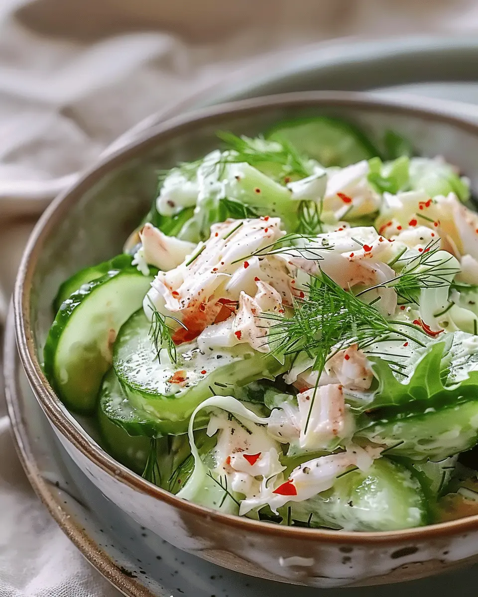 A refreshing summer salad combining the freshness of cucumbers with the delicate taste of crab meat.