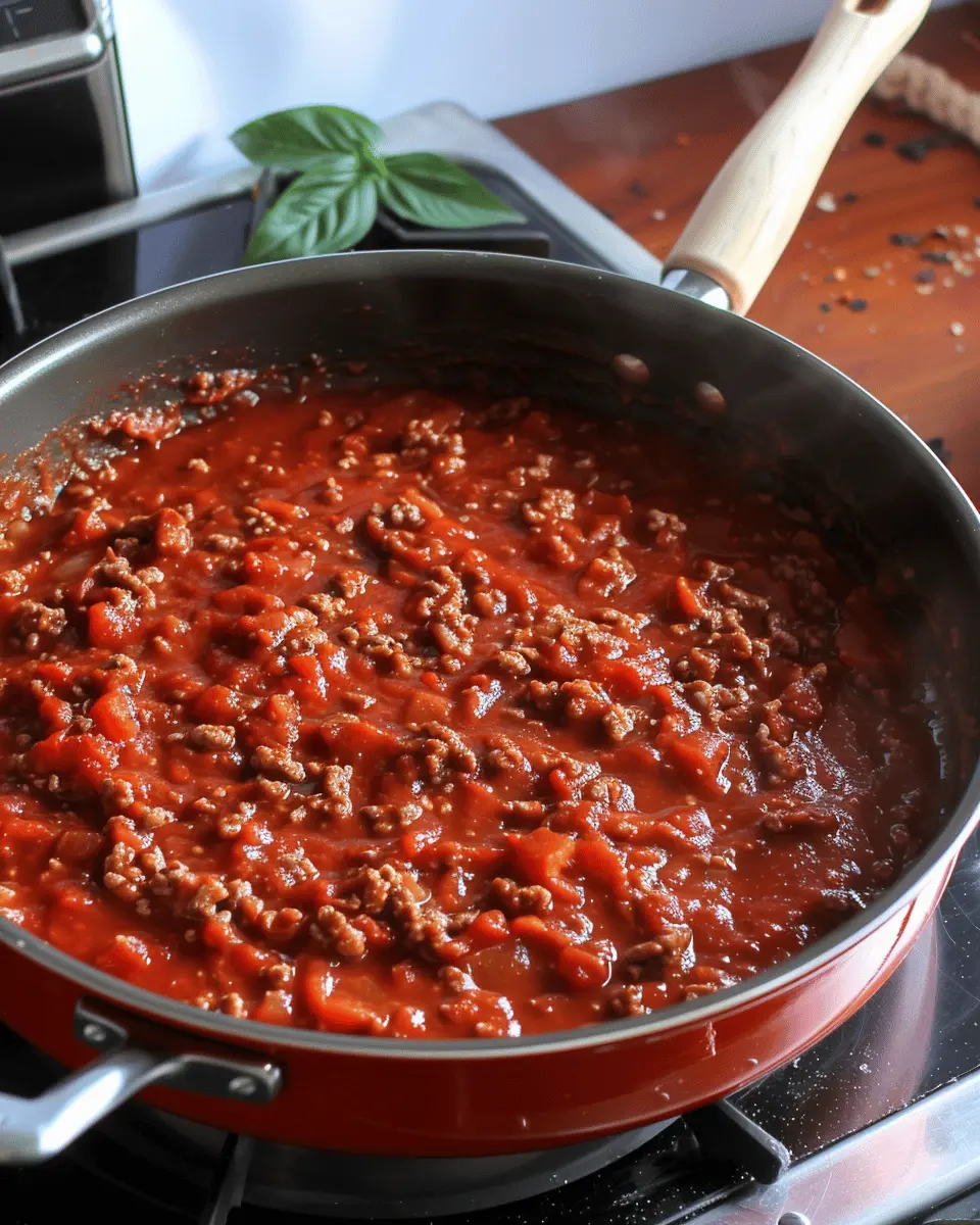 Make sure the beef is crumbled well and browned evenly—this step is key to achieving that restaurant-style sauce. For a deeper flavor profile, consider browning your meat in batches, allowing the pieces to sear properly.