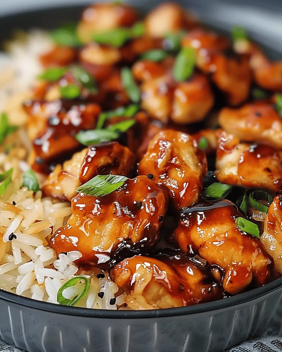 Delicious honey BBQ chicken served over fragrant rice, perfect for any occasion.