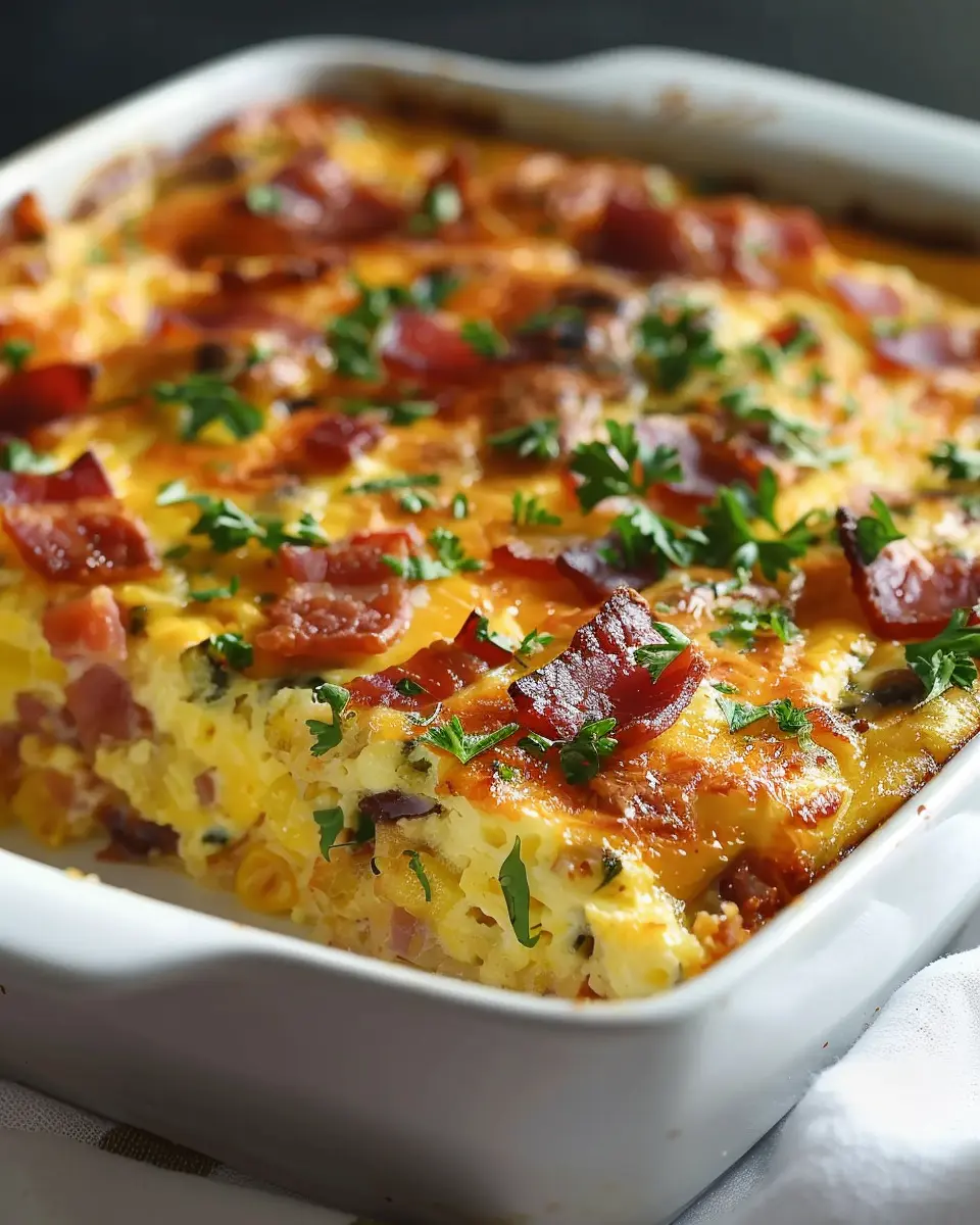 A delicious and hearty breakfast casserole featuring turkey bacon and chicken ham.