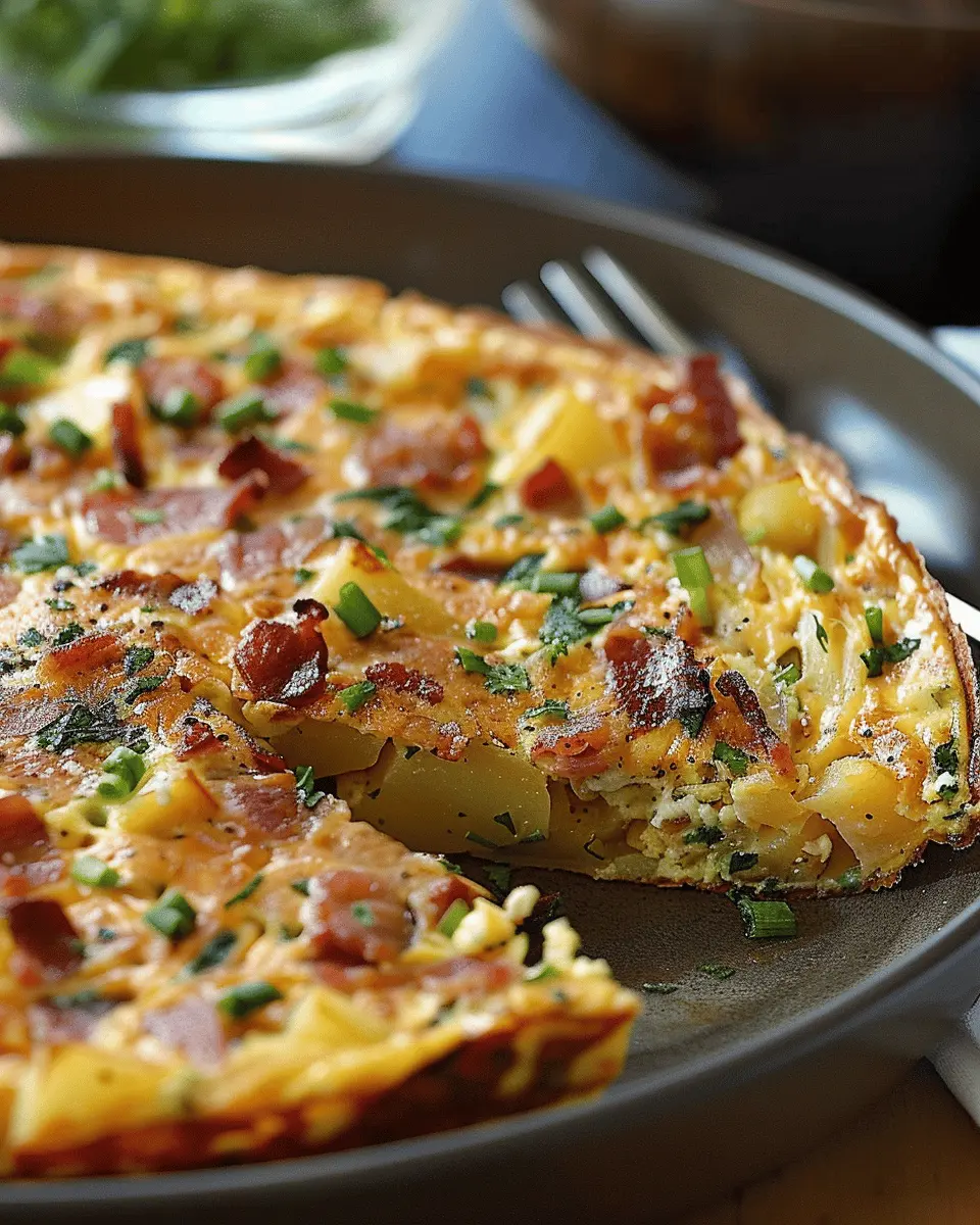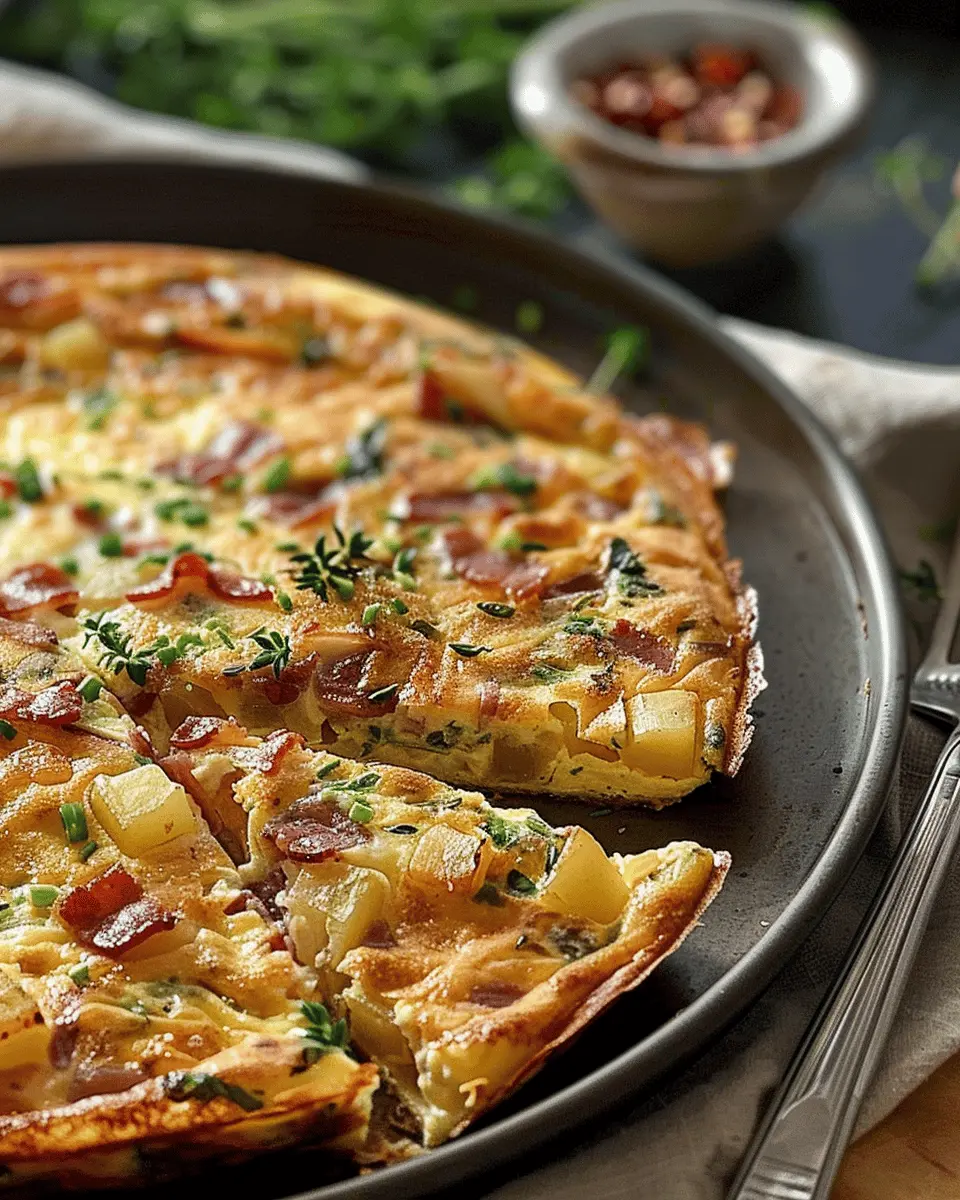A delicious and easy recipe for a brunch frittata featuring turkey bacon and potatoes, inspired by Ina Garten.