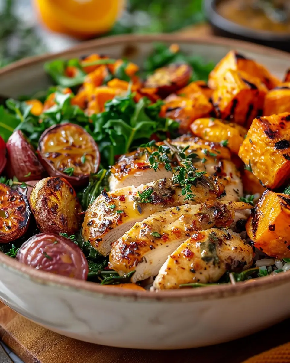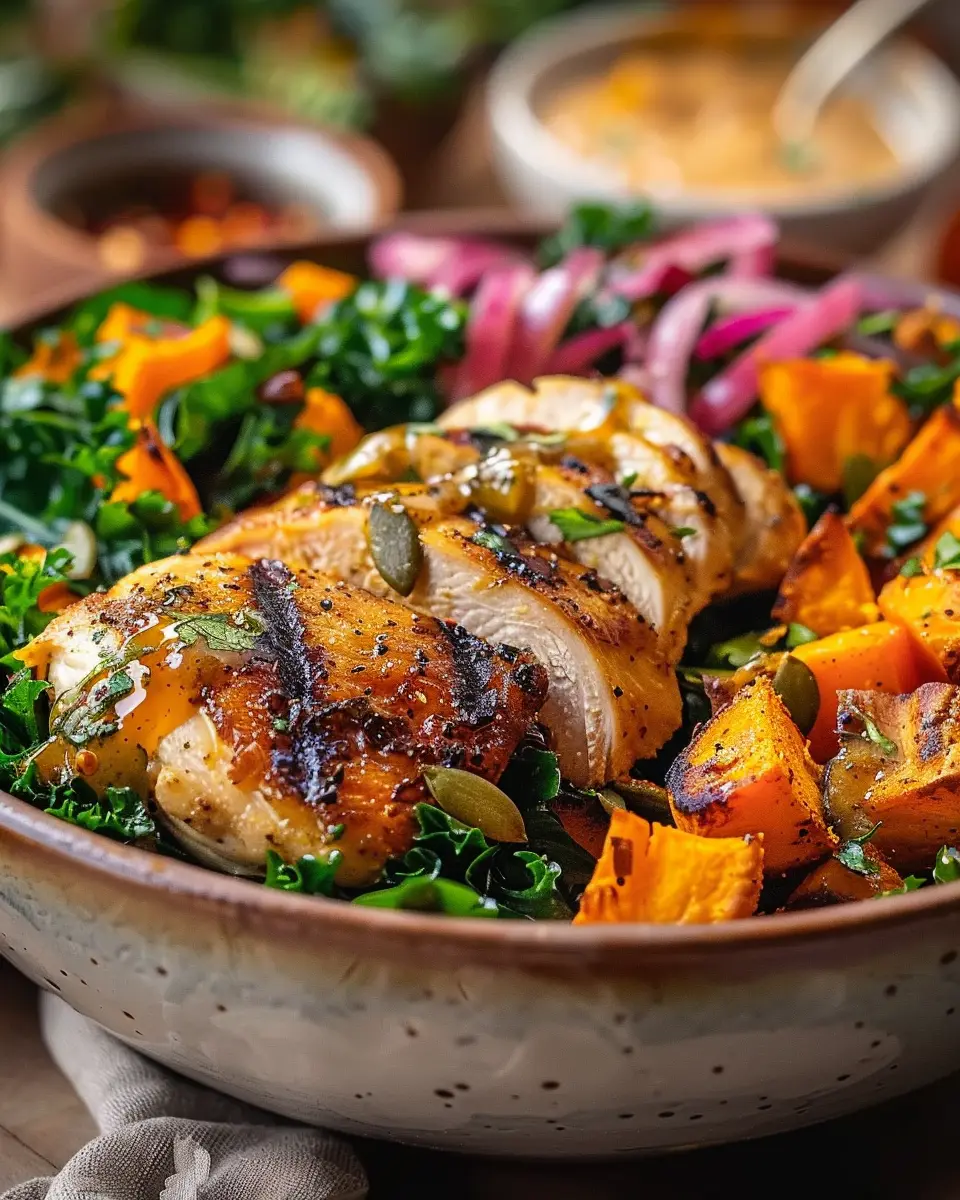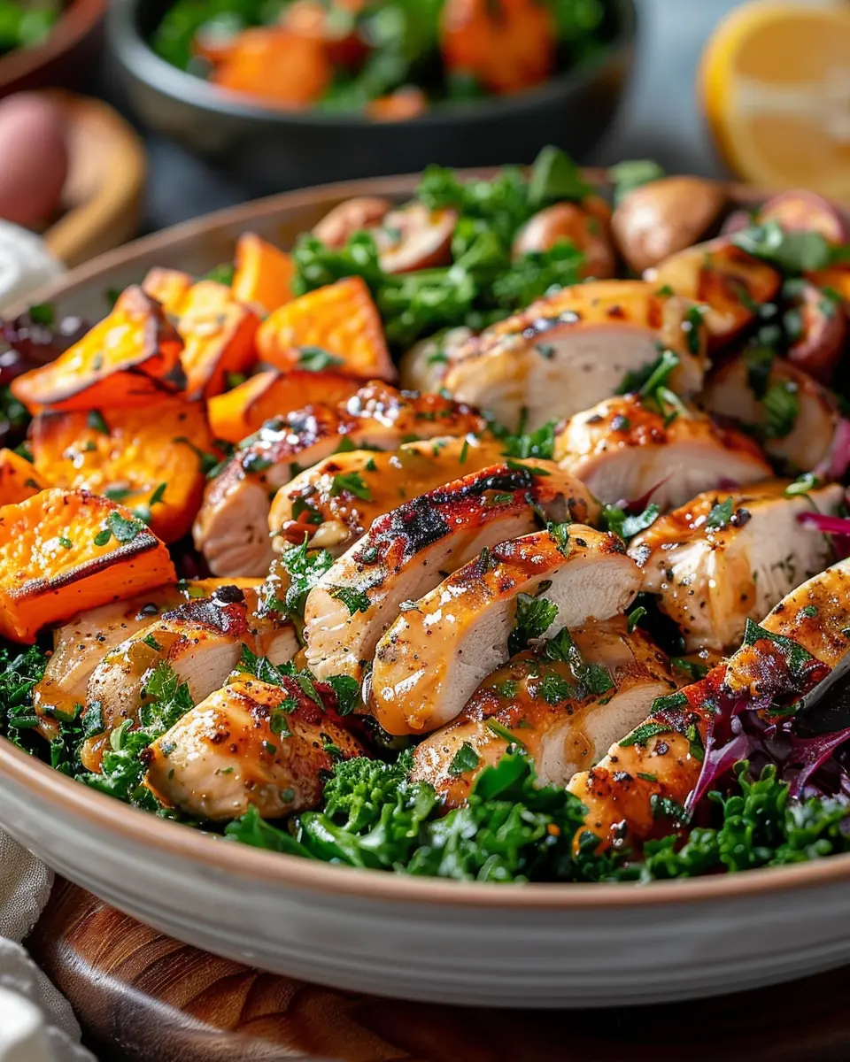 With everything cooked, it’s time to assemble your bowls. Start by layering fresh greens at the bottom of each bowl, followed by a generous scoop of the roasted sweet potatoes. Slice the Maple Dijon Chicken and arrange it on top. You can add extras like avocado, nuts, or seeds for texture.
