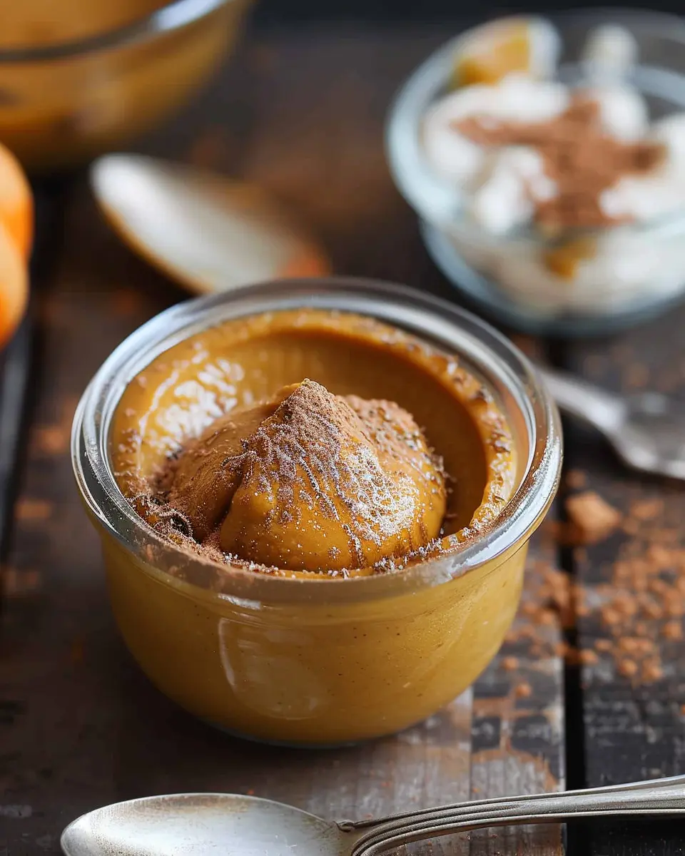 A delightful and rich pumpkin pot de crème perfect for the fall season. Enjoy this creamy dessert topped with whipped cream and a sprinkle of cinnamon.