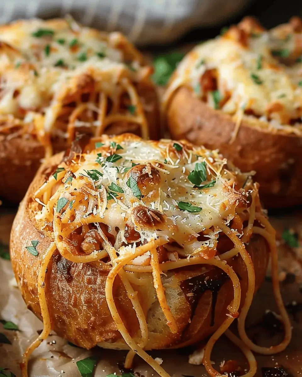 Now comes the fun part: assembling your spaghetti garlic bread bowls! Generously fill each hollowed roll with the spaghetti and sauce mixture.